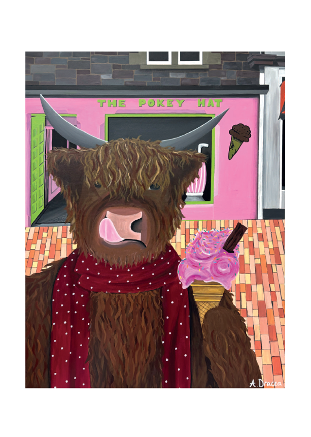 Bring home a piece of Oban with “The Pokey Hat” — an original, one-of-a-kind acrylic painting featuring a cheeky Highland cow enjoying a colorful ice cream outside The Pokey Hat, a beloved local landmark known for serving some of the best ice cream in Scotland 🍦🐮
